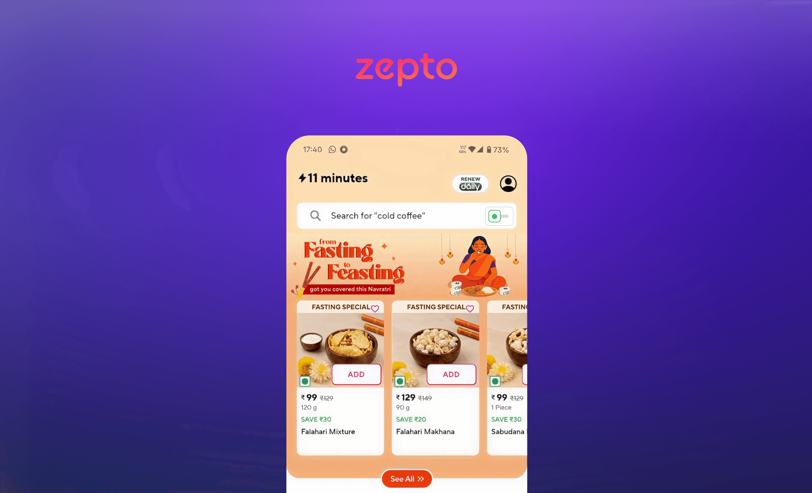 Users struggled to filter vegetarian items due to the absence of a Veg toggle in both Zepto and Zepto Café. This increases cognitive load and slows decision-making. Adding a simple toggle could streamline discovery and improve order speed.
