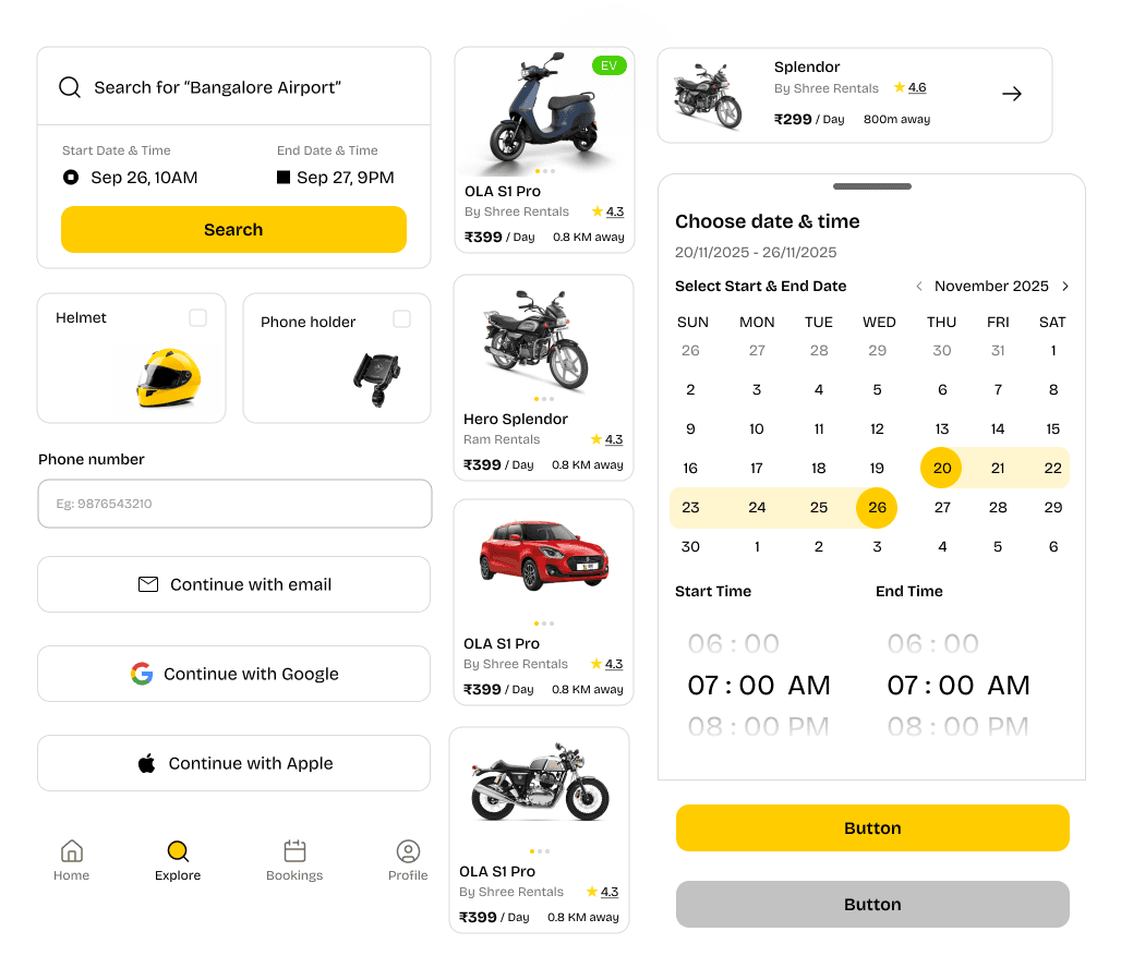 Our research showed that riders look for quick availability, transparent pricing and trusted dealers. They prefer a booking flow that does not overload them with choices. Dealers shared their need for digital visibility, real time management and easier verification. These insights guided us toward a simple design system, an upfront pricing model and a streamlined KYC flow that works smoothly for everyone.